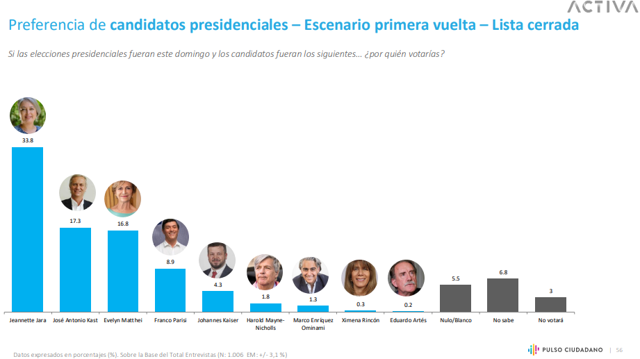 La candidata oficialista lideró el sondeo con un 31,4%, seguida por José Antonio Kast (18%), Evelyn Matthei (17,4%) y Franco Parisi (7,6%)