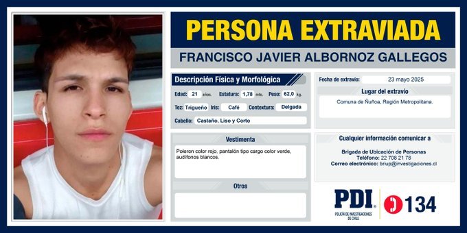 Francisco Javier Albornoz Gallegos, quien trabaja en una farmacia de Vitacura, salió desde su casa el 23 de mayo pasado desde el departamento donde residía, en Santiago Centro.